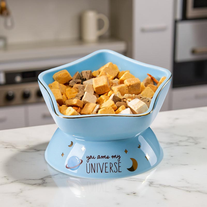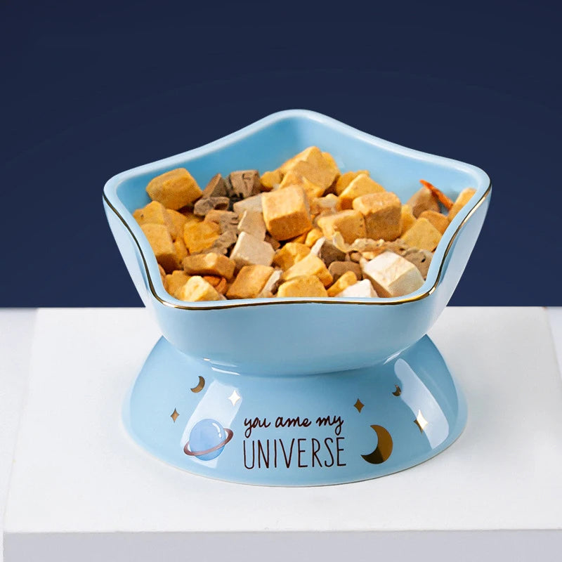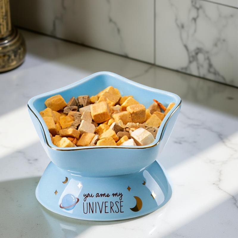 La StarFeast est une gamelle en céramique en forme d’étoile, surélevée et décorée de motifs galactiques dorés. Sa silhouette originale et son message “you are my universe” la rendent aussi unique que votre compagnon à quatre pattes. Adaptée pour croquettes, snacks ou petites portions, elle associe esthétique, stabilité et hygiène. Son rebord doré ajoute une touche d’élégance céleste à votre intérieur.